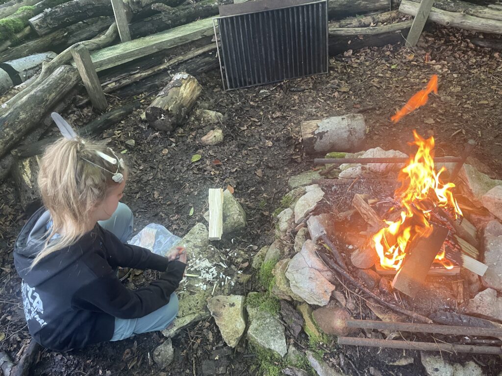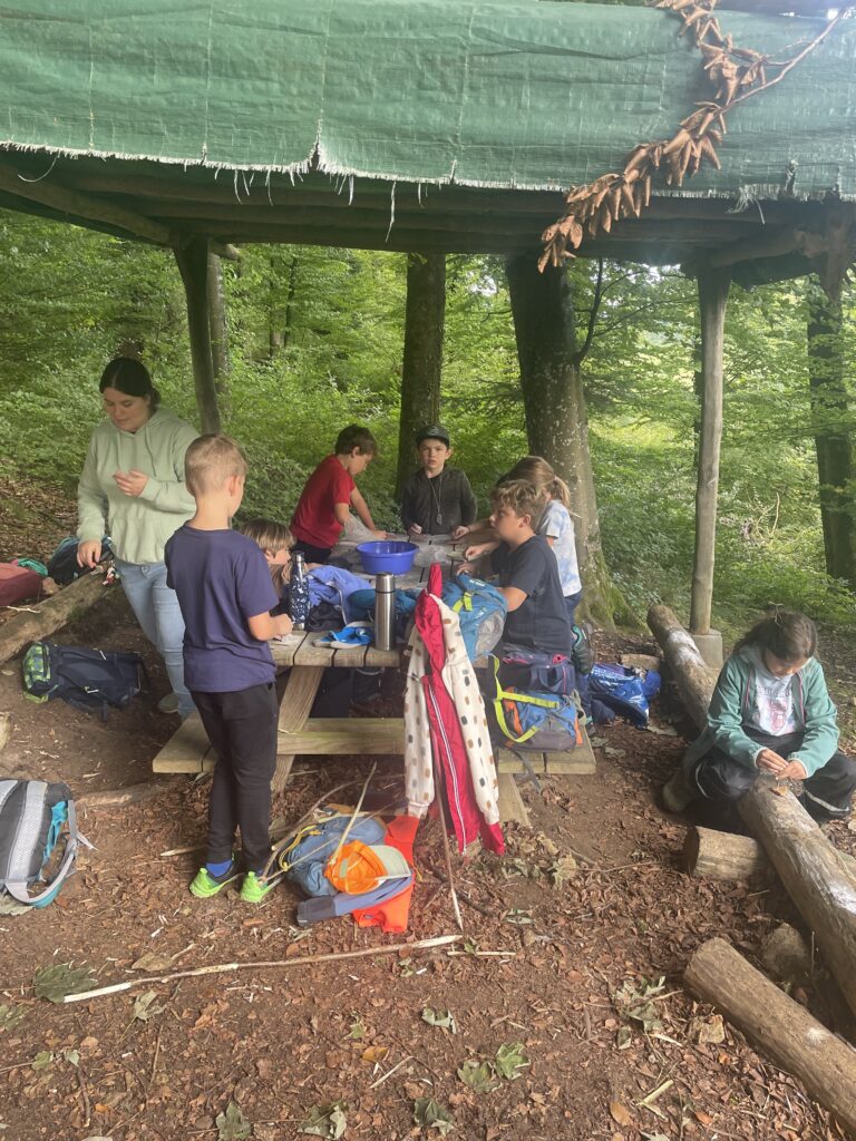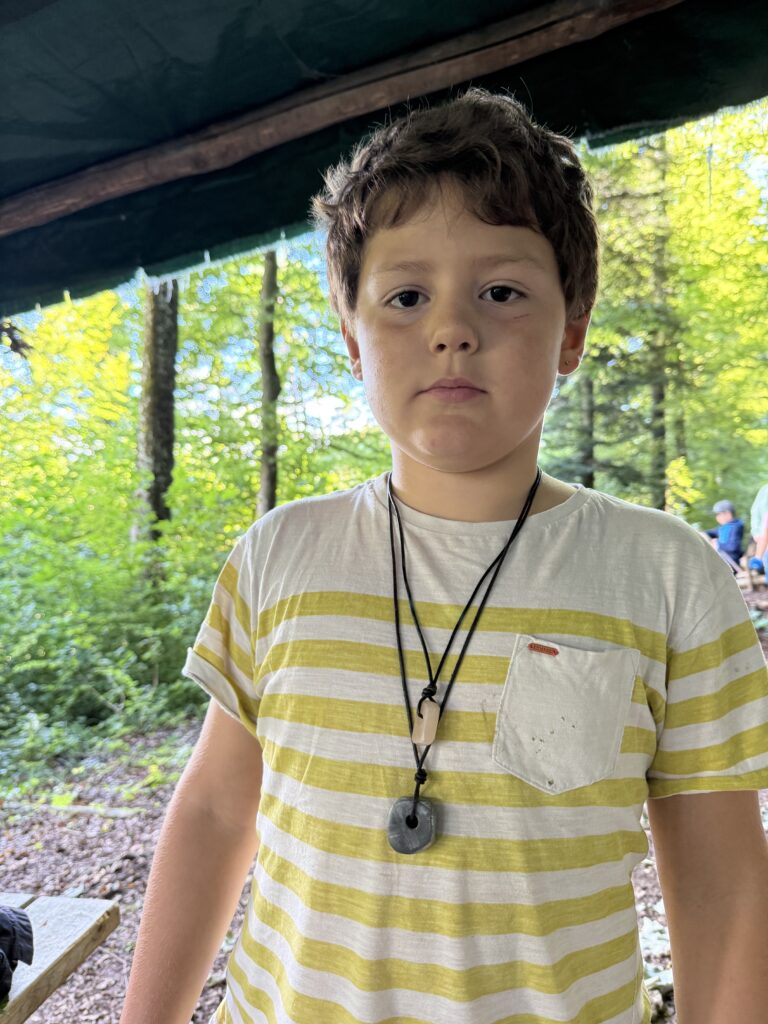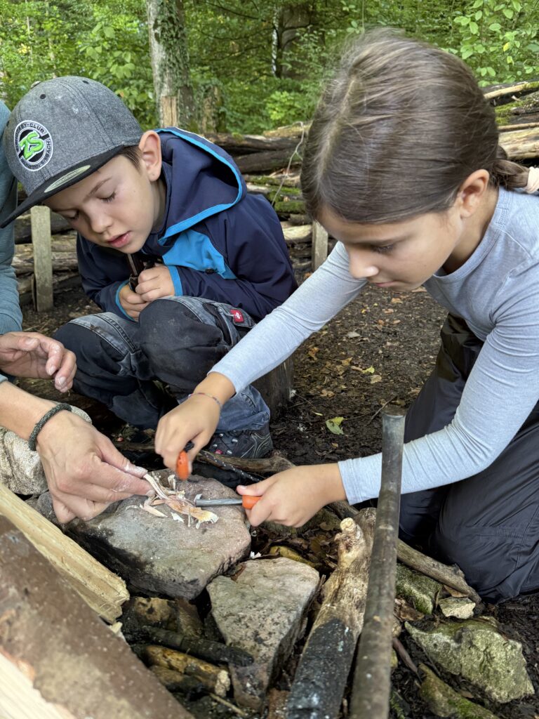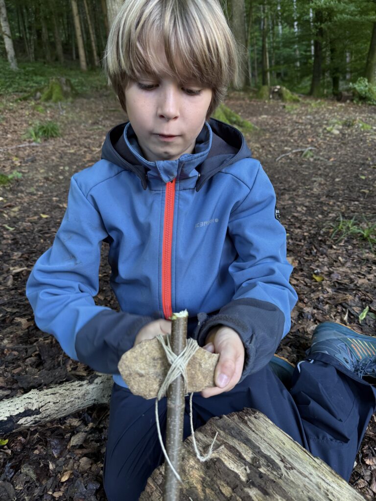 Es gab Häuser, Waffen, Werkzeug, Feuer machen, Speckstein schleifen. Zum Znüni machten wir Schlangenbrot. wir spielten toll zusammen im Wald. Die Waffen hatten wir gemacht: Pfeilbogen, Hammer, Äxte, Faustkeil.
